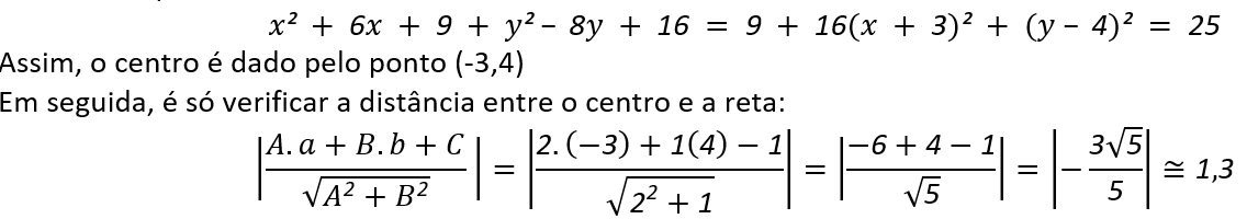 Percebe-se que a distância é menor do que a medida do raio, portanto a reta é secante.